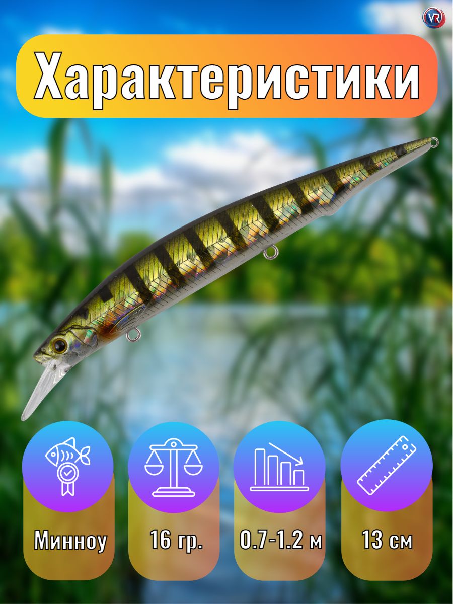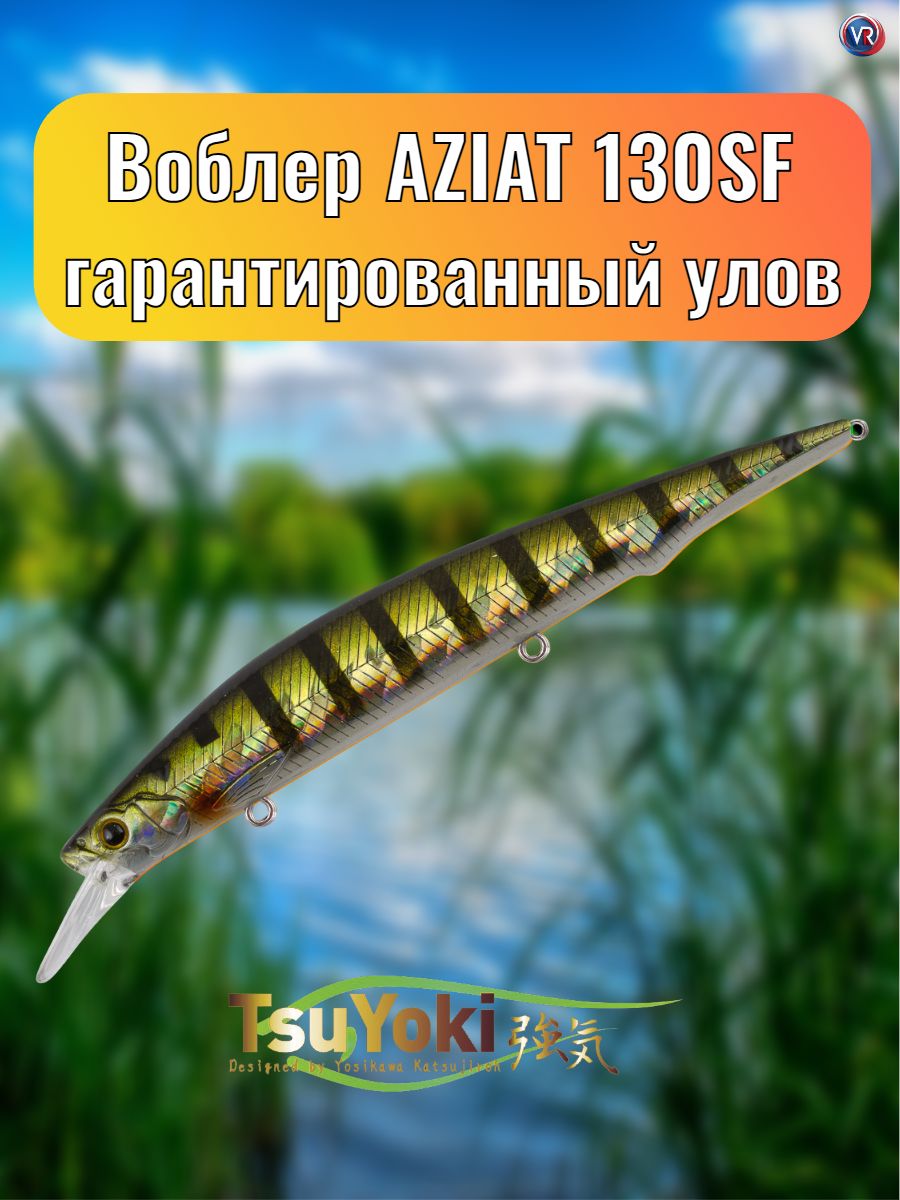 Технические параметры: медленно всплывающий (SF), длина 130 мм, вес 16,0 гр., заглубление 0,7-1,2 м. Крупный воблер класса «минноу» для ловли щуки, судака, жереха и других хищных рыб на реках, прудах и озерах. Особенности дизайна: AZIAT 130SF – крупный воблер-минноу узкой вытянутой формы, плавно сужающейся к хвосту приманки. По бокам воблера имеются две разделенные боковой линией рельефные фактуры поверхности в виде косых насечек. Головная часть воблера рельефно имитирует жаберные крышки рыбки, а 3D глаза дополняют реалистичность дизайна всей приманки. Встроенная система дальнего заброса одновременно является системой баланса приманки и шумовой камерой. Воблер достаточно громкий, при проводке привлекает рыбу не только своей игрой, но и выраженным шумовым сопровождением. В оснащении воблера использованы три острых тройника, качественная фурнитура и заводные кольца. Воблер имеет современное лакокрасочное покрытие и широкий выбор расцветок в каталоге. Заброс и анимация: благодаря системе дальнего заброса AZIAT 130SF при использовании сбалансированной снасти улетает на 40-45 метров. Анимация AZIAT 130SF типична для воблеров данного класса. Основной тип проводки – твичинг (рывковая анимация). На рывке воблер уходит в сторону от своей оси с разворотом на 90+ градусов, при этом присутствует ярко выраженный «роллинг» (показывает брюшко). На паузе воблер зависает в толще воды в горизонтальном положении и медленно всплывает к поверхности. Остаточные колебания у приманки практически отсутствуют. Основные трофеи AZIAT 130SF: щука, судак, жерех. Рекомендуемый комплект снастей: удилище длиной 6,6-7,6 фута быстрого строя, с верхним тестом до 21-32 гр., катушка размера 3000-4000, шнур #0.8-1.2 по японской классификации.