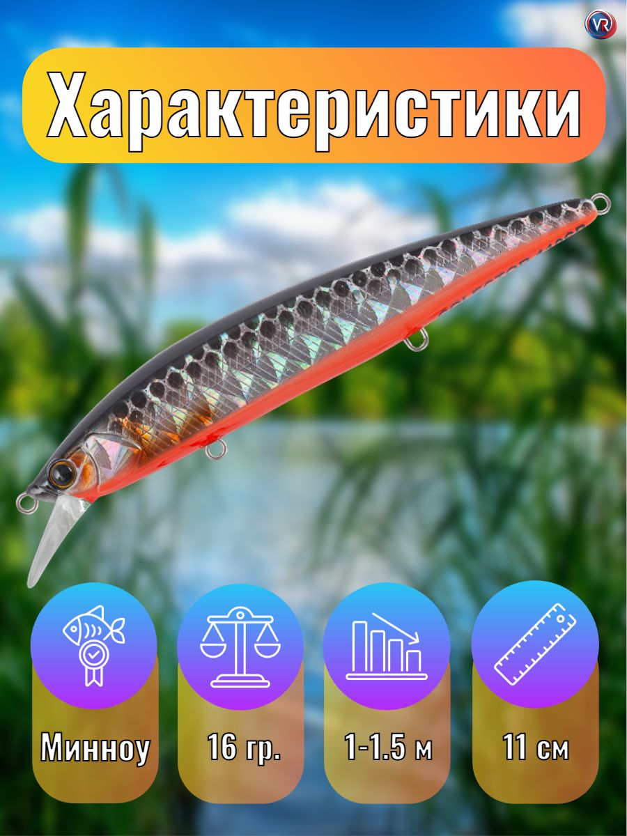 Целевые трофеи: щука, судак, жерех и крупный окунь. Особенности дизайна: COLECTOR 110 SP имеет две разделенные боковой линией рельефные фактуры поверхности. Верхняя часть выполнена в виде ромбовидных насечек, нижняя - в виде косых насечек, создающих эффект рыбьей чешуи. Головная часть воблера имитирует жаберные крышки рыбки. Вклеенные 3D-глаза завершают реалистичный дизайн приманки. COLECTOR 110 SP оснащен тремя острейшими тройниками соответствующего приманке размера, силовой фурнитурой и заводными кольцами. Лакокрасочное покрытие качественное и прочное, соответствующее всем современным стандартам. В конструкции воблера применена эффективная система дальнего заброса, а также система баланса, которые при проводке создают довольно громкое шумовое сопровождение. Заброс и анимация: COLECTOR 110 SP является дальнобойной приманкой. При тестах воблер улетал к отметкам 45-50 метров. Тесты на дальность проводились с удилищем длиной 7,3 фута быстрого строя, с тестом 5-21 гр. и катушкой 4000 по японской шкале, с восьмижильным шнуром #1 по японской классификации. Дальний заброс и стабильное поведение приманки в полете позволяют использовать COLECTOR 110 SP как воблер-поисковик, способный за короткий период облавливать большие площади акватории, а также в качестве приманки для точечного облова локальных «окон» среди коряг или водной растительности. COLECTOR 110 SP на равномерной проводке имеет выраженную собственную игру, активно раскачиваясь из стороны в сторону и виляя хвостовой частью. При проводке стоп-энд-гоу COLECTOR 110 SP на активной фазе роллингует и устойчиво зависает на паузе с остаточными колебаниями в начале остановки. При рывковой анимации воблер охотно отзывается на любую манипуляцию удилищем. На акцентированных коротких рывках воблер мощно роллингует, уходя в сторону от оси проводки, разворачивается до 90 градусов и зависает с остаточными колебаниями в начальной фазе паузы. На более мягких рывках послушно исполняет глайды с роллингом и бликами.