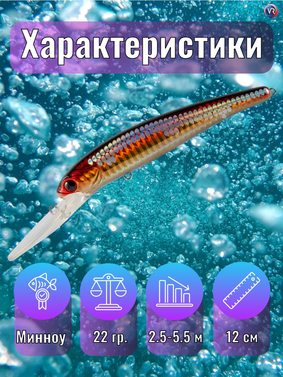 При отпуске шнура (0.2 мм) около 40 - метров и скорости катера 3.5 - 4.0 км/час воблер заглубляется глубже 6 метров, показывая при этом малоамплитудную высокочастотную игру, характерную для приманок хорошо работающих по судаку. Наилучших результатов воблер добивается, если во время проводки он будет время от времени касаться дна, выбивая муть со дна. Не надо бояться зацепов при этом. Широкая и прочная лопата надежно защитит крючки воблера. Цветовые решения, позволят Вам без труда подобрать нужную модель под любые условия ловли.