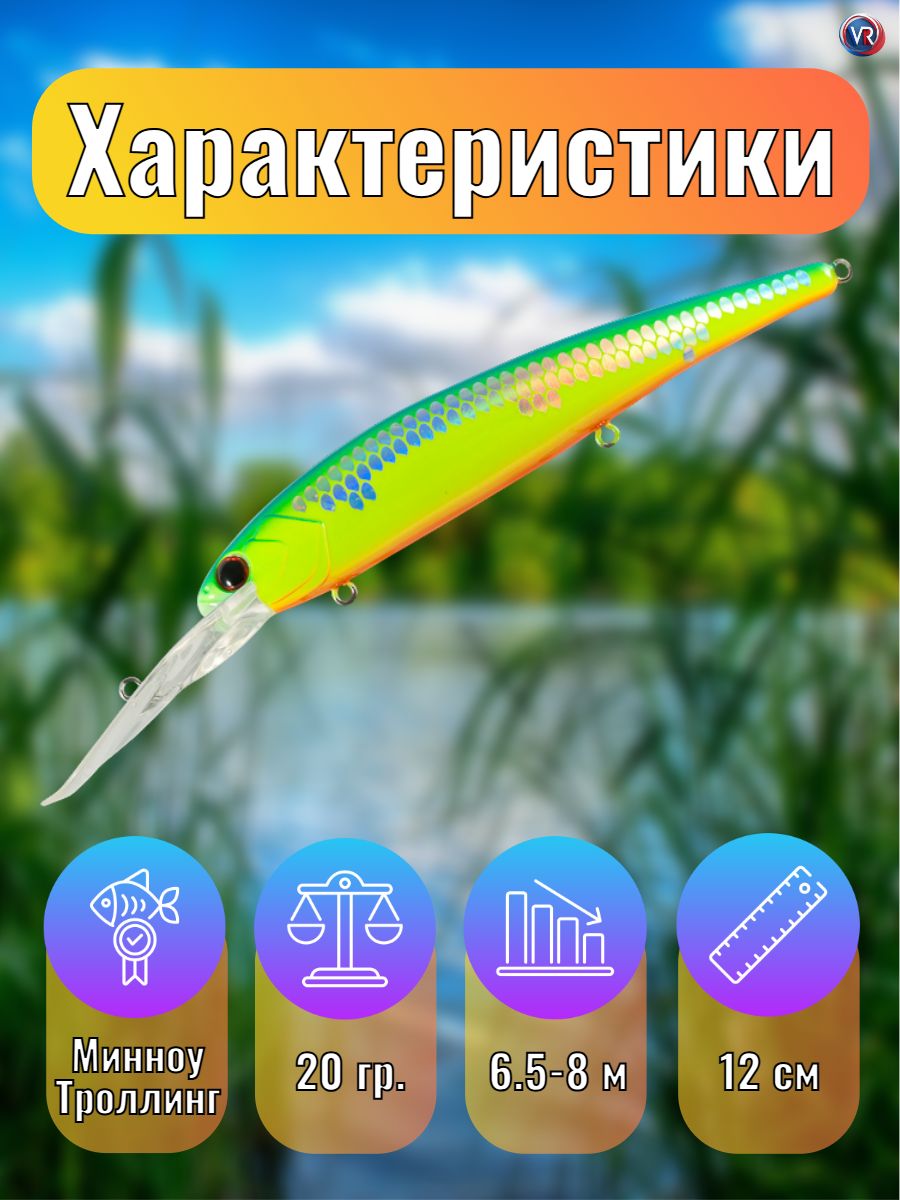 Крупный минноу для ловли троллингом на неоднородном рельефе и свалах с глубинами 5-9 метров. Основные трофеи – судак, щука, сом.