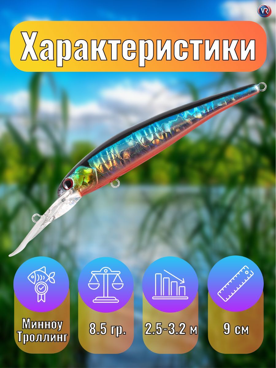 Минноу для ловли троллингом на неоднородном рельефе и свалах с глубинами до 5 метров. Основные трофеи – судак, щука, сом. Особенности дизайна: имеет полностью гладкую поверхность. Головная часть приманки выполнена в виде головы рыбки, с рельефными жаберными крышками и вклеенными 3D глазами. Имеет систему баланса, шары которой выполняют функцию шумового сопровождения, создавая дополнительный фактор привлечения для хищников. Воблер оснащен мощной фурнитурой, силовыми заводными кольцами и тремя тройниками. Общее исполнение воблера и его ЛКП на высоком современном уровне. Анимация: При буксировке с помощью катера (троллинге) совершает акцентированные колебания, издалека привлекающие хищников и провоцирующие их на поклевку. Выбор места для ловли троллингом – важный фактор, влияющий на конечный результат рыбалки. Правильным будет облов бровок с глубинами, соответствующими рабочему диапазону, как с движением катера против течения, так и по течению. Нужно учитывать, что при движении по течению воблер будет заглубляться несколько больше, чем против. Так же интерес представляют поливы с неоднородным рельефом (буграми и ямками) и наличием редких коряг, являющихся идеальным укрытием для хищников. Непосредственно по коряге приманку проводить не стоит, но пройти недалеко от нее непременно нужно. Наличие на таком поливе стай кормовой рыбы будет дополнительным плюсом для успешной ловли. Контроль дна ловле троллингом обязателен. Только если воблер с некоторой периодичностью задевает лопастью дно, вы можете быть уверены, что длина отпуска приманки и скорость движения катера правильные. Троллинг – хороший помощник в поиске активной рыбы. Если в каком либо месте вашего маршрута случится поклевка или поимка судака, непременно стоит остановиться и обловить это место другими приманками (например , джиговыми), или диповыми моделями воблеров. Судак обычно охотится стаями, и поймав одного троллингом, вполне можно рассчитывать на несколько поклевок с этой же точки.