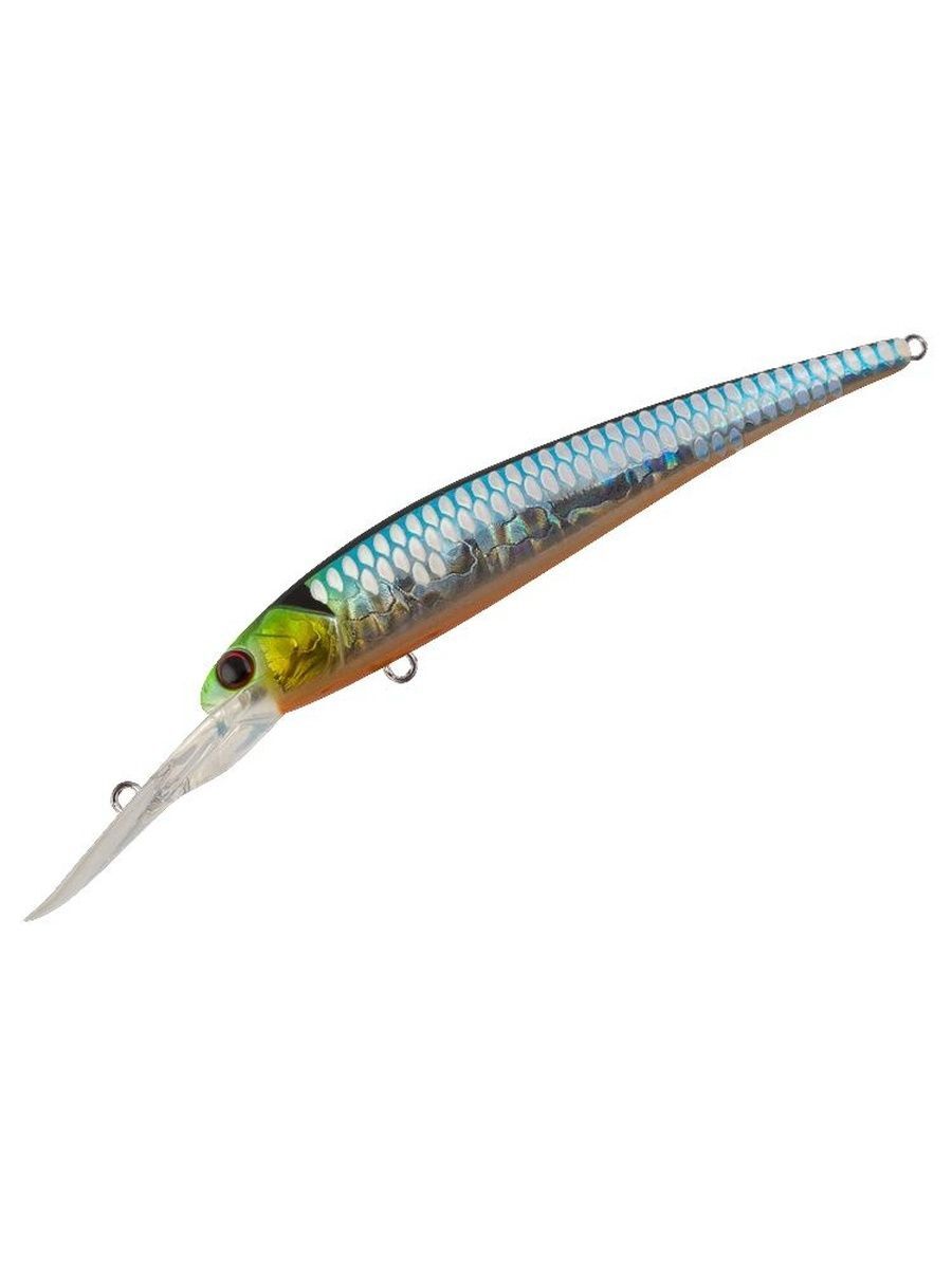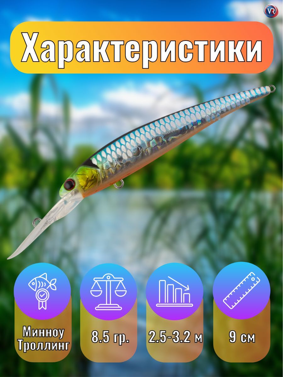 Минноу для ловли троллингом на неоднородном рельефе и свалах с глубинами до 5 метров. Основные трофеи – судак, щука, сом. Особенности дизайна: имеет полностью гладкую поверхность. Головная часть приманки выполнена в виде головы рыбки, с рельефными жаберными крышками и вклеенными 3D глазами. Имеет систему баланса, шары которой выполняют функцию шумового сопровождения, создавая дополнительный фактор привлечения для хищников. Воблер оснащен мощной фурнитурой, силовыми заводными кольцами и тремя тройниками. Общее исполнение воблера и его ЛКП на высоком современном уровне. Анимация: При буксировке с помощью катера (троллинге) совершает акцентированные колебания, издалека привлекающие хищников и провоцирующие их на поклевку. Выбор места для ловли троллингом – важный фактор, влияющий на конечный результат рыбалки. Правильным будет облов бровок с глубинами, соответствующими рабочему диапазону, как с движением катера против течения, так и по течению. Нужно учитывать, что при движении по течению воблер будет заглубляться несколько больше, чем против. Так же интерес представляют поливы с неоднородным рельефом (буграми и ямками) и наличием редких коряг, являющихся идеальным укрытием для хищников. Непосредственно по коряге приманку проводить не стоит, но пройти недалеко от нее непременно нужно. Наличие на таком поливе стай кормовой рыбы будет дополнительным плюсом для успешной ловли. Контроль дна ловле троллингом обязателен. Только если воблер с некоторой периодичностью задевает лопастью дно, вы можете быть уверены, что длина отпуска приманки и скорость движения катера правильные. Троллинг – хороший помощник в поиске активной рыбы. Если в каком либо месте вашего маршрута случится поклевка или поимка судака, непременно стоит остановиться и обловить это место другими приманками (например , джиговыми), или диповыми моделями воблеров. Судак обычно охотится стаями, и поймав одного троллингом, вполне можно рассчитывать на несколько поклевок с этой же точки.