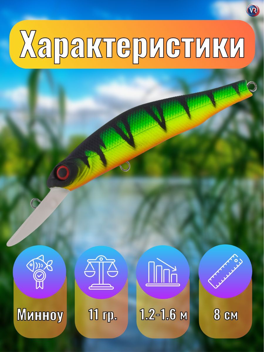 Средне-размерный минноу. Особенности дизайна: имеет две, разделенные боковой линией, рельефные фактуры поверхности. Верхняя часть выполнена в виде ромбовидных насечек , нижняя- в виде косых насечек, создающих эффект рыбьей чешуи. Головная часть воблера имитирует жаберные крышки рыбки. Крупные вклеенные 3D глаза завершают реалистичный дизайн приманки. WATSON DR 80 SP оснащен системой дальнего заброса и системой баланса, создающей тихое шумовое сопровождение при анимации . Воблер имеет два тройника Owner Cultiva соответствующего размера, силовую фурнитуру и заводные кольца. Качественное ЛКП, соответствующее современным стандартам. Заброс и анимация :WATSON DR 80 SP улетал при тестах к отметкам 32-35+ метров. Тесты на дальность проводились с удилищем длиной 7,8 фута быстрого строя , тест 7- 21 гр, катушка 3000 по линейке Шимано, шнур #1,2. Такая дальность заброса позволяет использовать WATSON DR 80 SP и как воблер-поисковик, способный за короткий период облавливать большие площади акватории, и как приманку для локальной ловли , требующей точного заброса. На равномерной проводке ярко выраженную собственную игру, активно раскачиваясь с боку на бок и виляя хвостовой частью. Эту его особенность обязательно нужно использовать при ловле хищника. При проводке стоп-энд-гоу на активной фазе роллингует и устойчиво зависает в паузе с заметными остаточными колебаниями в начале остановки . При рывковой анимации воблер в меру упористый и очень отзывчив на любую манипуляцию удилищем. На акцентированных коротких рывках воблер мощно роллингует, уходя в сторону от оси проводки, разворачивается до 90 градусов и зависает с сильными остаточными колебаниями в начальной фазе паузы. На более мягких рывках послушно исполняет глайды с роллингом и бликами. Основным целевым трофеем будет щука и крупный, трофейный окунь. При ловле над бровками с глубинами 3-4 метра и кормовыми поливами, расположенными недалеко от русла можно ожидать и поклевок судака. В прилове возможны голавль и жерех…