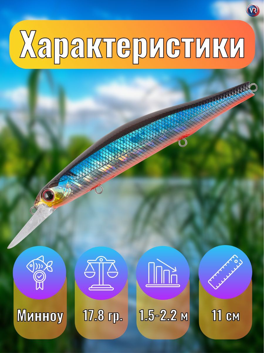 Среднеразмерный воблер-минноу для ловли на водоёмах с фоновыми глубинами от 2 до 5 метров.