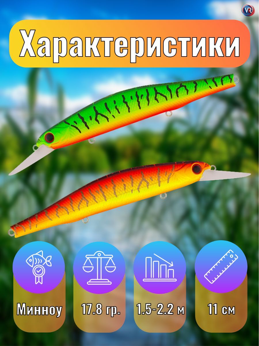 Среднеразмерный воблер-минноу для ловли на водоёмах с фоновыми глубинами от 2 до 5 метров.